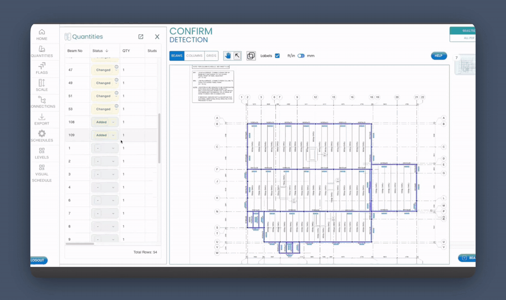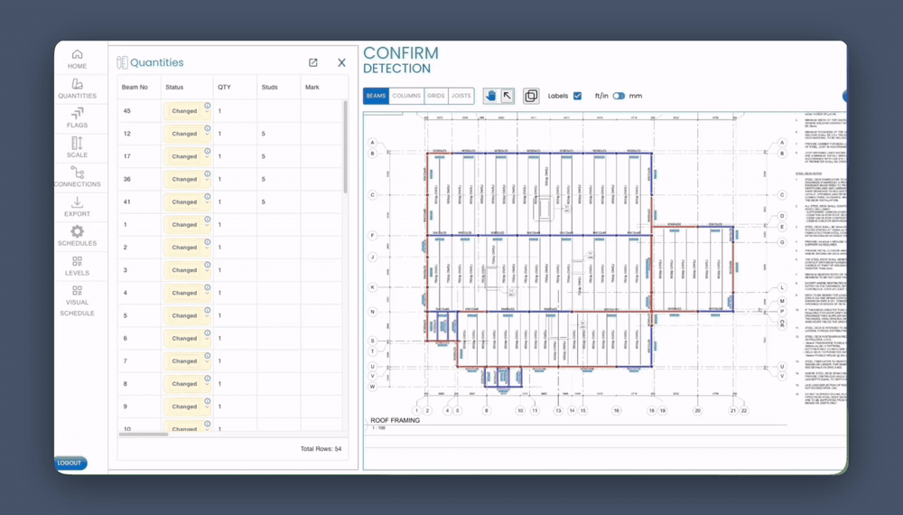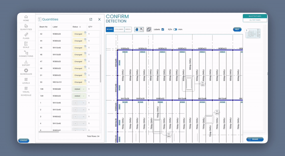 AI compares the two sets member by member. Adds, deducts, and modifications are flagged automatically. Toggle the overlay to validate: green means new, red means removed. Click any member in the table to locate it on the drawing.