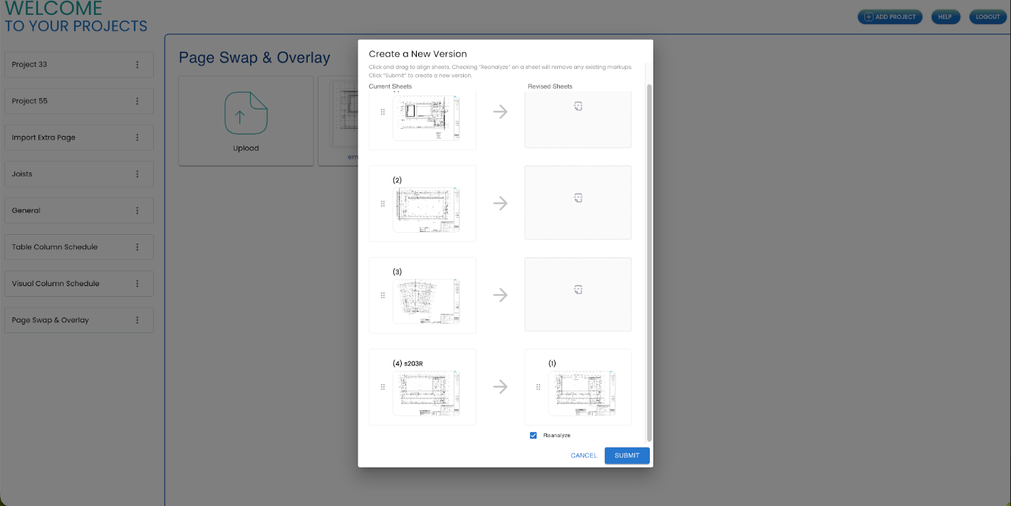 Upload your revised set and LIFT identifies every add, deduct, and modification, no manual overlay required.