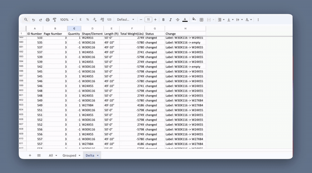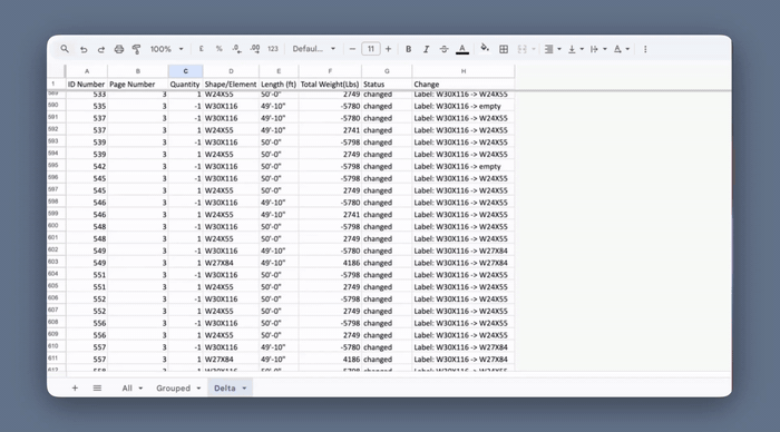 Full BOM export with added, changed, and deducted flags on every member. Tonnage summaries for adds, deducts, and net changes. Import change data directly into PowerFab with the Delta Report.